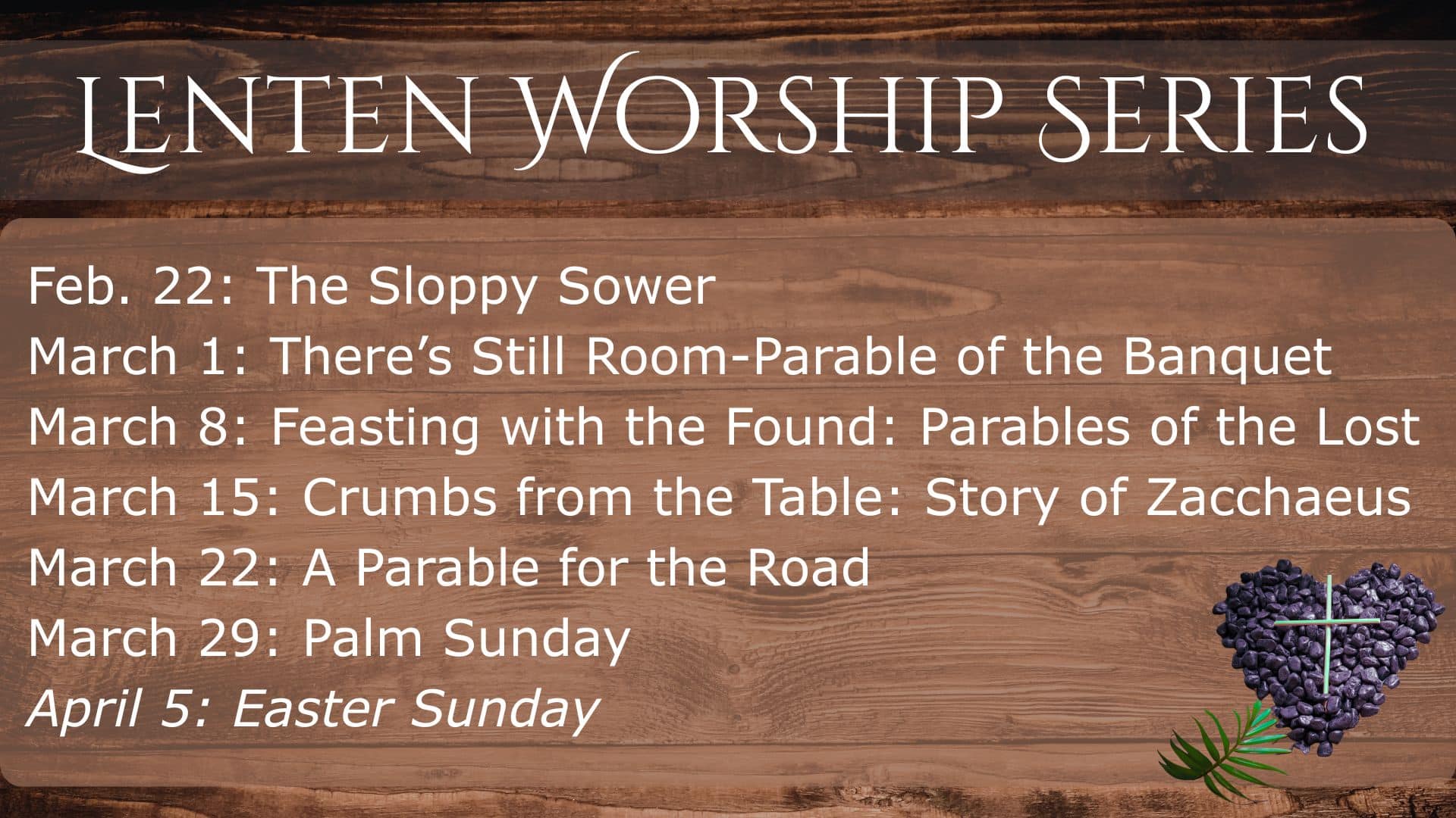 Easter Sunday services will be held at our normal time, 9:30 am on Easter Sunday, April 5. You are invited to bring your cut flowers to place on our large cross to symbolize new life and resurrection. You may want to take a family photo in front