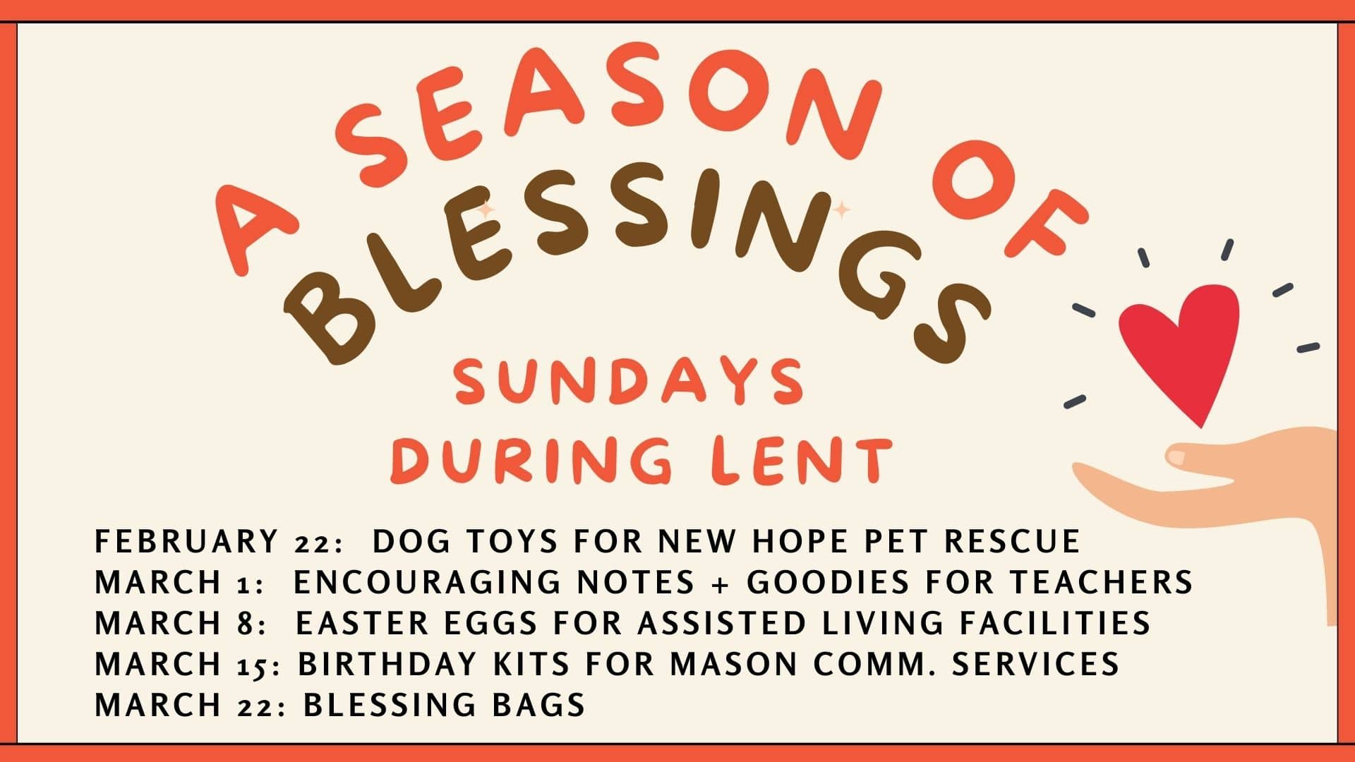 Join us this season of Lent. Following each service, we will also be celebrating a Season of Giving, completing projects to support our community. It's a great time to check out what Mason First UMC has to offer!
