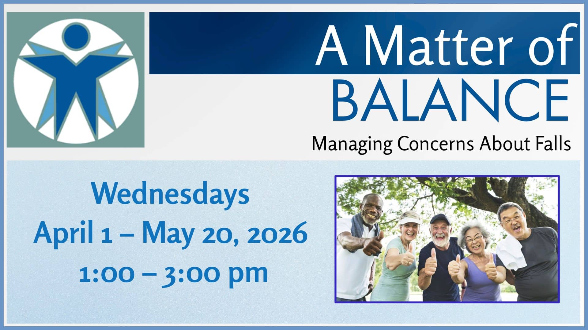 Do you have concerns about falling? Attend a workshop for help! Many older adults experience concerns about falling and may restrict their activities because of these fears. MATTER OF BALANCE is an eight-session workshop designed to improve balance, flexibility, and strength, helping people reduce fall risks, strengthen their confidence, and become more active.