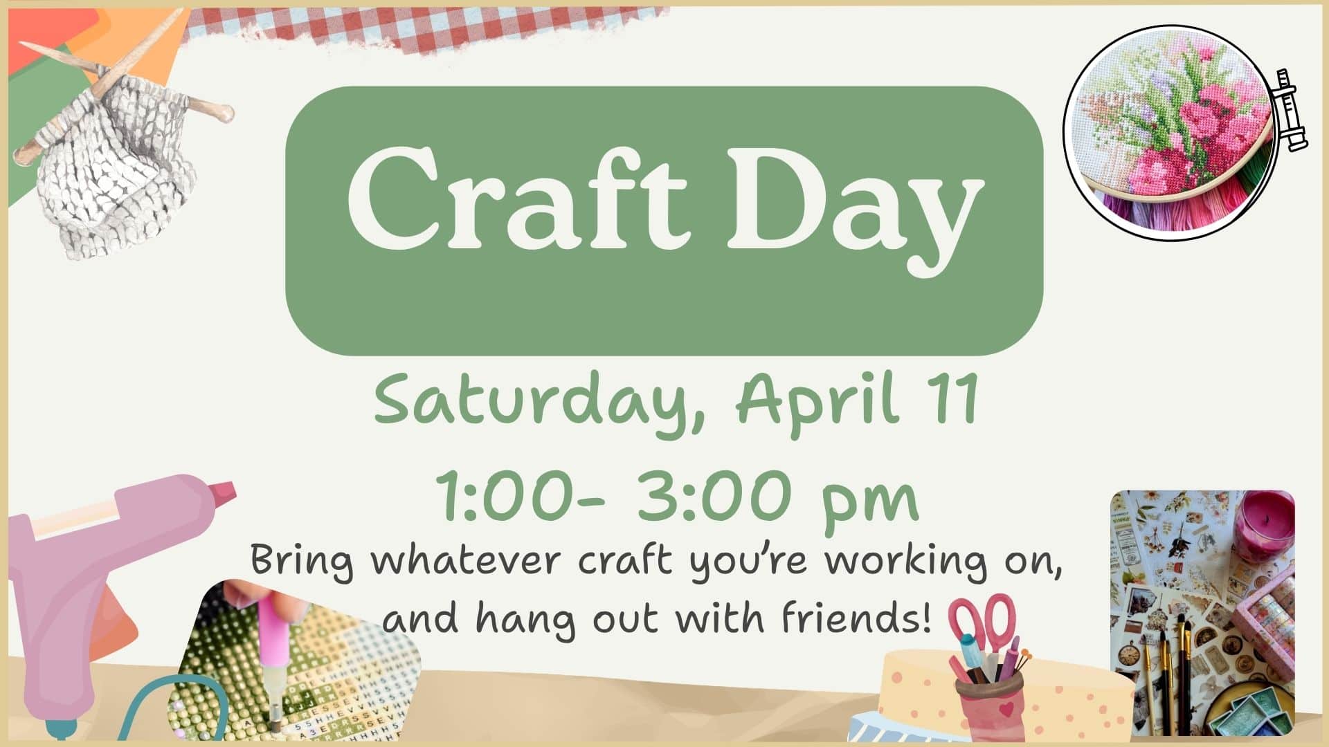 All are welcome to join us for another craft day! Bring whatever craft you’re working on and enjoy time with friends. Feel free to bring a snack to share if you’d like and your own drink. No need to sign up.